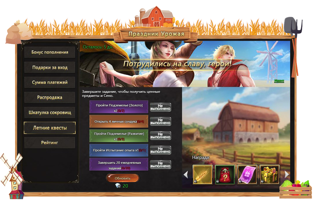 Захватывающие приключения, грандиозные битвы и увлекательные испытания ждут отважных героев. Выполняйте задания, получайте призы и специальные предметы Рейтинга!