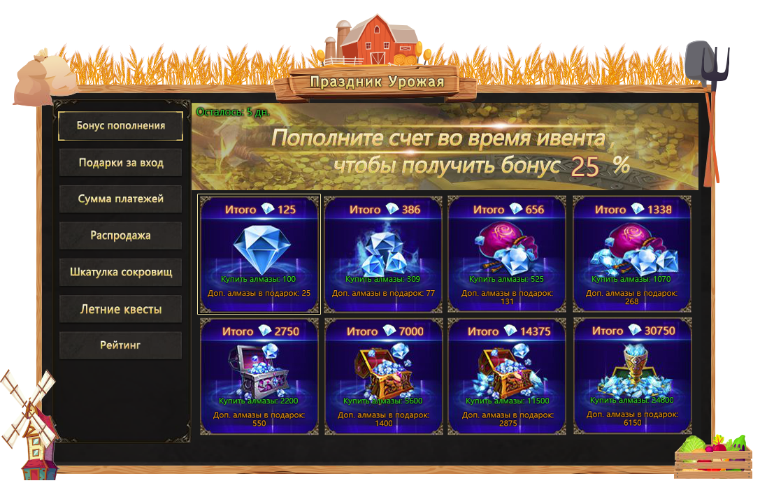 При общей покупке алмазов на определенную сумму вас ждут приятные бонусы в виде ценных призовых наборов.