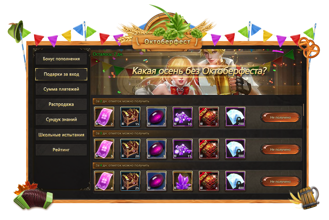 Заходите в игру в течение 7 дней и получайте награды. Соберите все подарки праздничного фестиваля!