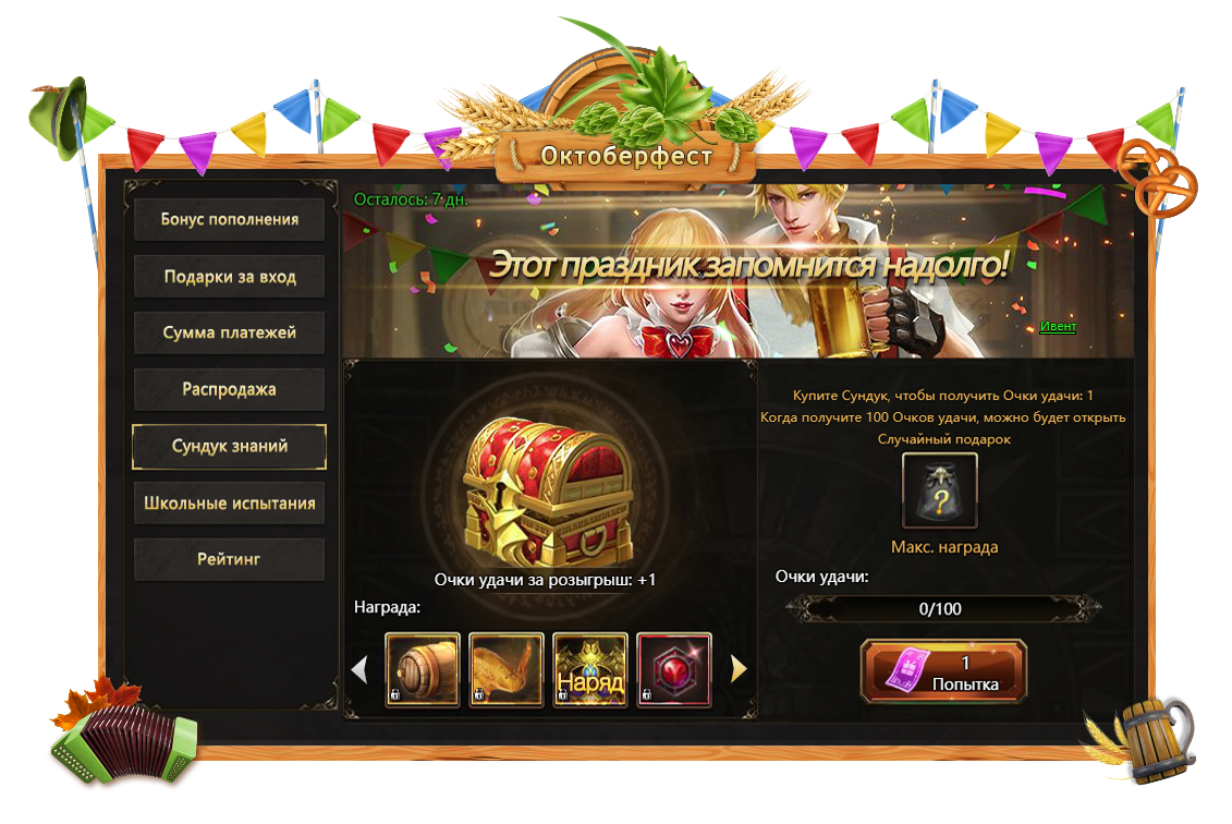 Очень грустно, что Октоберфест отменили в этом году... везде, кроме мира Rise of Angels! В нашей игре героев по традиции будут ждать увеселительные мероприятия, вкуснейшие деликатесы и незабываемые наряды в стиле праздника! Давно хотелось отведать сочных куриных крылышек? Полетать на волшебном бочонке? Подружиться с забавной таксой? Тогда добро пожаловать на Октоберфест! Уже завтра, 25 сентября, в 12:00 по московскому времени в игре стартуют праздничные события с разнообразными ивентами и акциями, также будут запущены активности «Игромания»«Омут желаний» и «Карты богини». Мероприятия продлятся до 12:00 2 октября по московскому времени.