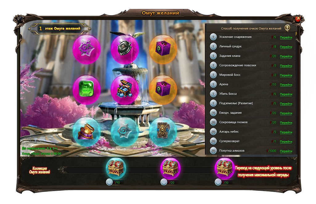 Все выше и выше вздымаются ярусы волшебного фонтана. Выполняйте задания Омута желаний, получайте очки и выбирайте понравившуюся награду соответствующей ступени.