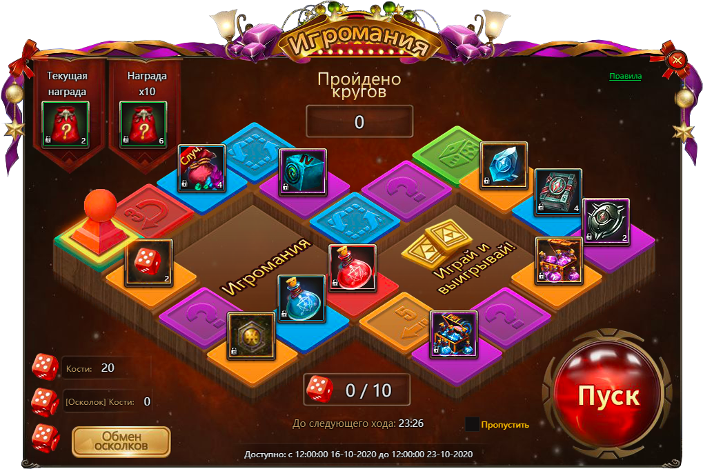 Участвуйте в событии «Игромания» – бросайте кости, перемещайтесь по игральной доске и получайте призы. Испытайте удачу, и пусть улыбка Фортуны принесет вам множество призов!