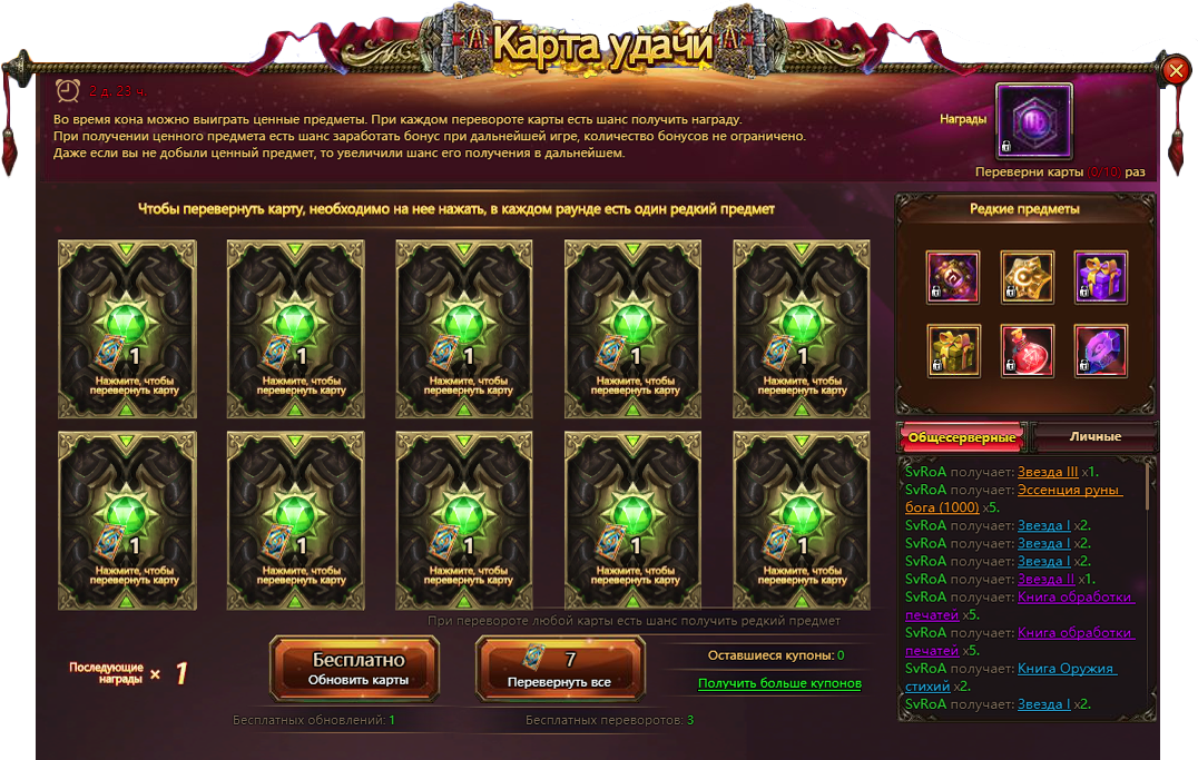 Переворачивайте карты и получайте ценные призы! В каждом раунде есть шанс выиграть один из редких предметов, а сама карта, содержащая такой приз, может принести бонус умножения наград последующих карт этого набора.