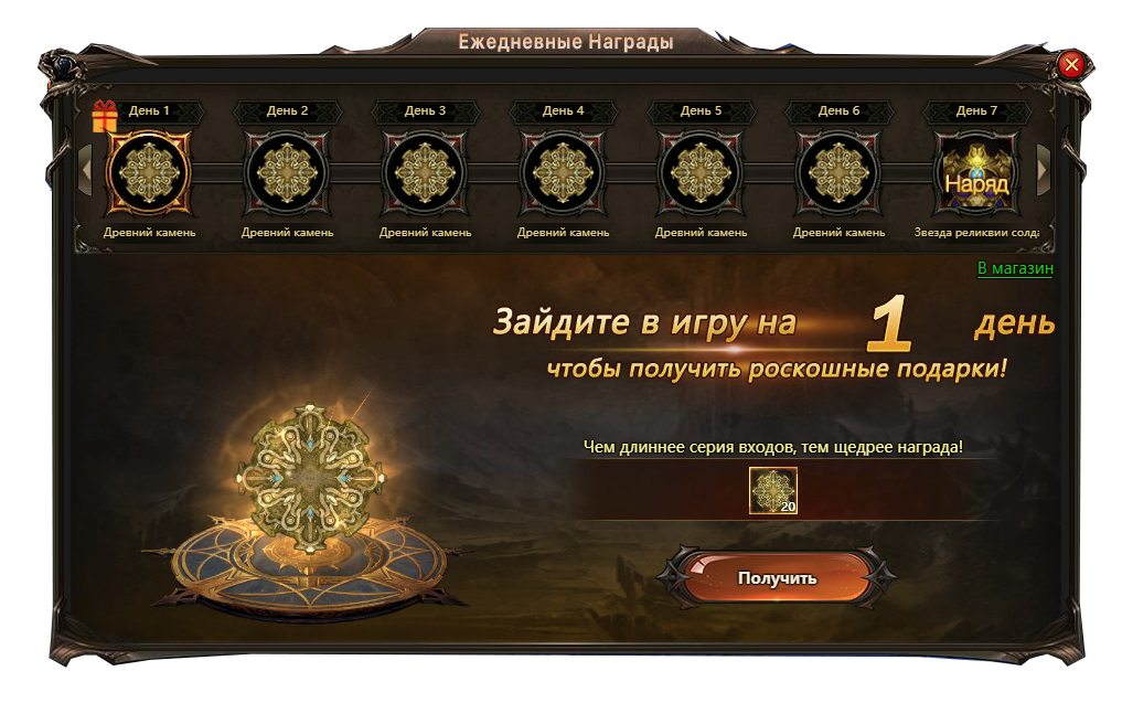 Древние камни можно также приобрести в магазине (Сундук древних камней). Количество получаемых предметов в ивенте зависит от вип-карты персонажа.
