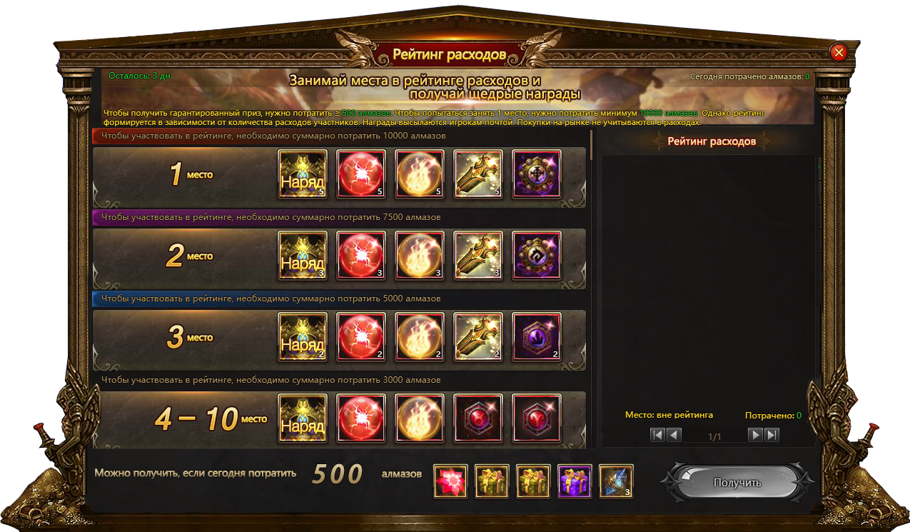 При трате алмазов в рамках данного ивента у вас есть шанс занять почетное место в специальном рейтинге и стать обладателем множества наград. Кроме того, при трате на сумму не менее 500 алмазов за один день вы можете получить набор ценных призов.