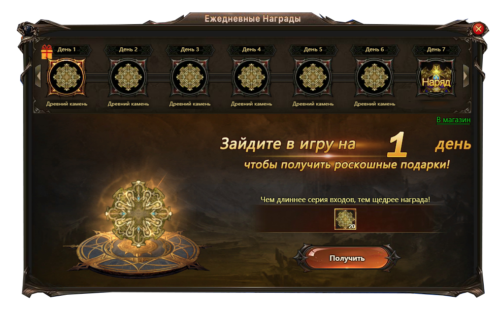 Древние камни можно также приобрести в магазине (Сундук древних камней). Количество получаемых предметов в ивенте зависит от вип-карты персонажа.