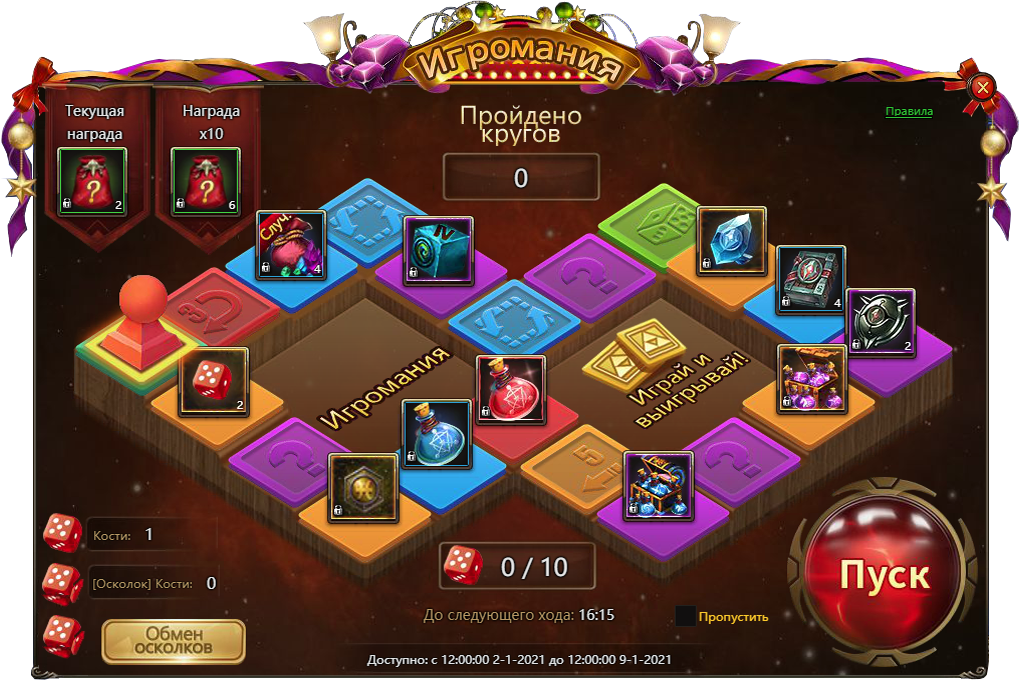 Участвуйте в событии «Игромания» – бросайте кости, перемещайтесь по игральной доске и получайте призы. Испытайте удачу, и пусть улыбка Фортуны принесет вам множество призов!