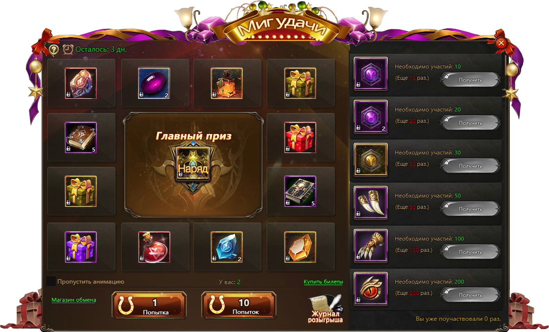 Богиня удачи ждет героев в своей обители. Бросьте ей вызов и выиграйте ценные призы! Каждая попытка вращения принесет вам случайную награду рулетки, кроме того, вас ждут бонусные награды при достижении определенного количества участий.