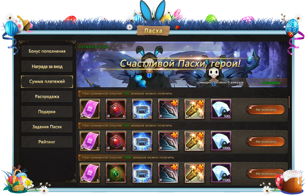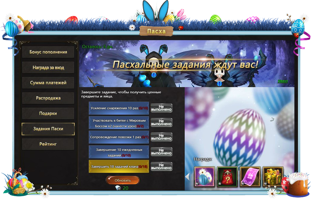 Герои! В этом событии вам предстоит собирать пасхальные корзинки. Объединитесь вместе с другими бойцами своего сервера и завоюйте призы для всех и каждого! А лидеры рейтинга получат поистине королевские награды.