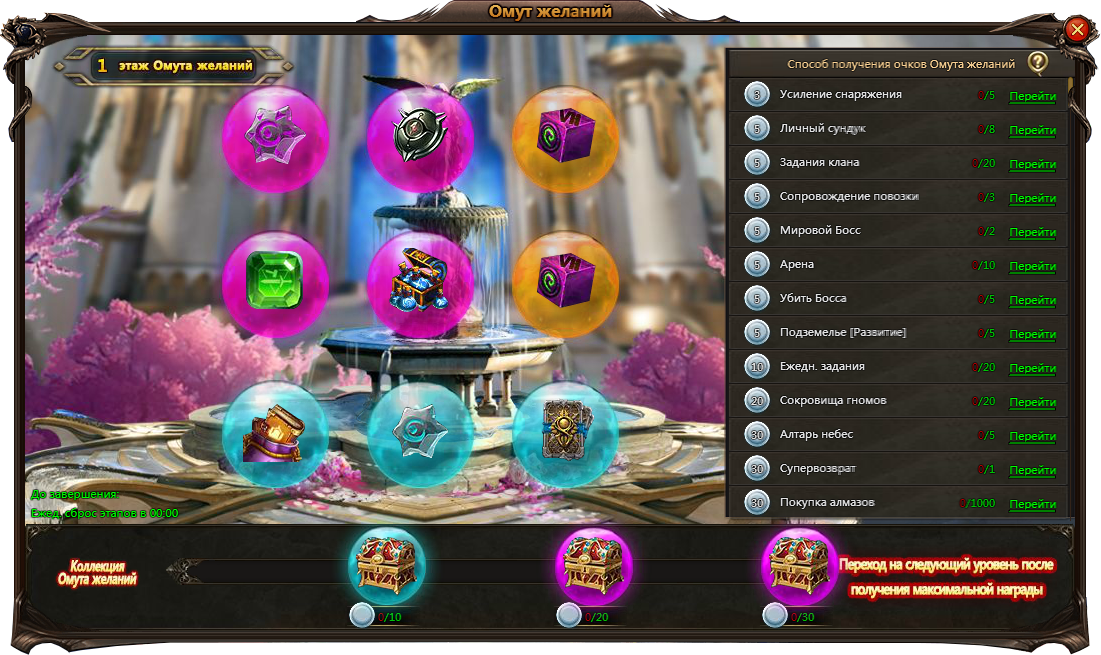 Все выше и выше вздымаются ярусы волшебного фонтана. Выполняйте задания Омута желаний, получайте очки и выбирайте понравившуюся награду соответствующей ступени.