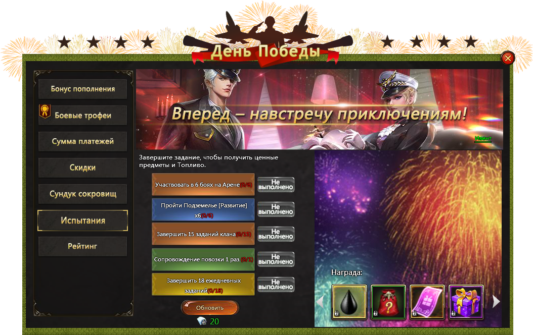 Завтра, 9 мая, в 12:00 по московскому времени в игре стартуют различные ивенты и акции в рамках события «День Победы», кроме того, будут запущены ивенты «Игромания» и «Омут желаний». Мероприятия продлятся до 12:00 16 мая по московскому времени.