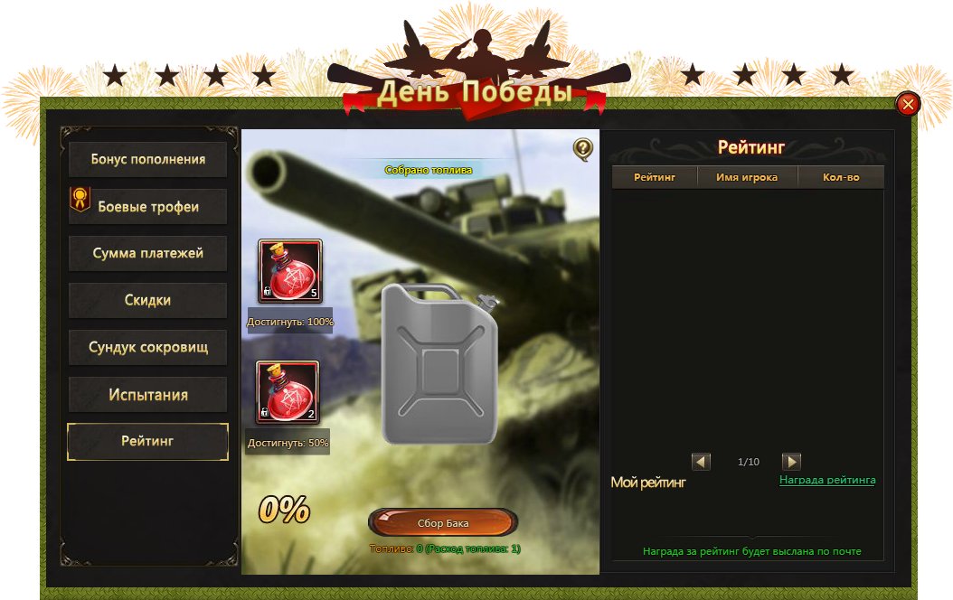 Боевая техника почти готова, дело за малым — необходимо наполнить топливные баки, для этого вместе с другими героями своего сервера используйте добытое Топливо