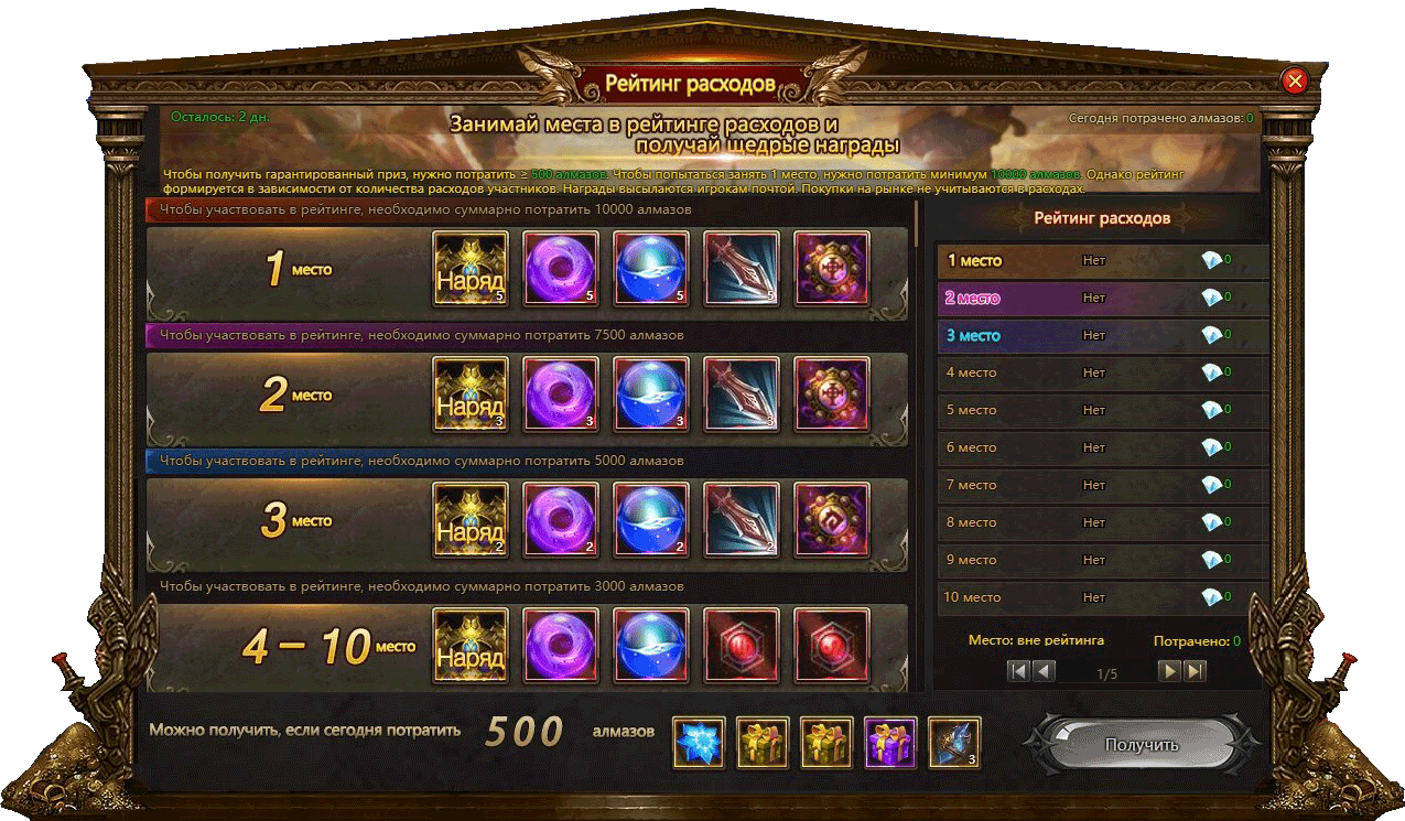 При трате алмазов в рамках данного ивента у вас есть шанс занять почетное место в специальном рейтинге и стать обладателем множества наград. Кроме того, при трате на сумму не менее 500 алмазов за один день вы можете получить набор ценных призов.