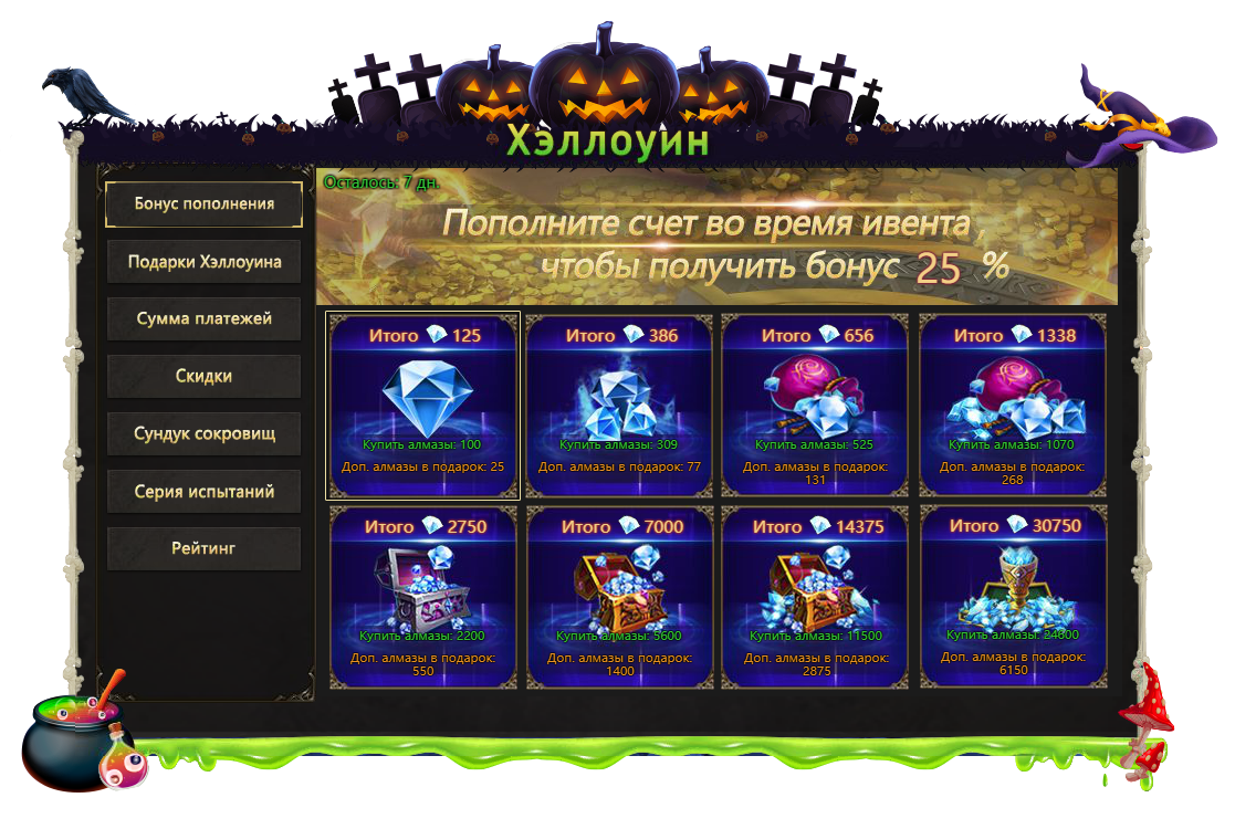 При общей покупке алмазов на определенную сумму вас ждут приятные бонусы в виде ценных призовых наборов.