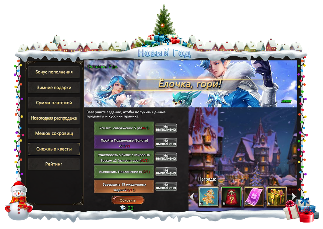 Заходите в игру в течение 7 дней и получайте награды. Соберите все подарки праздничного фестиваля!