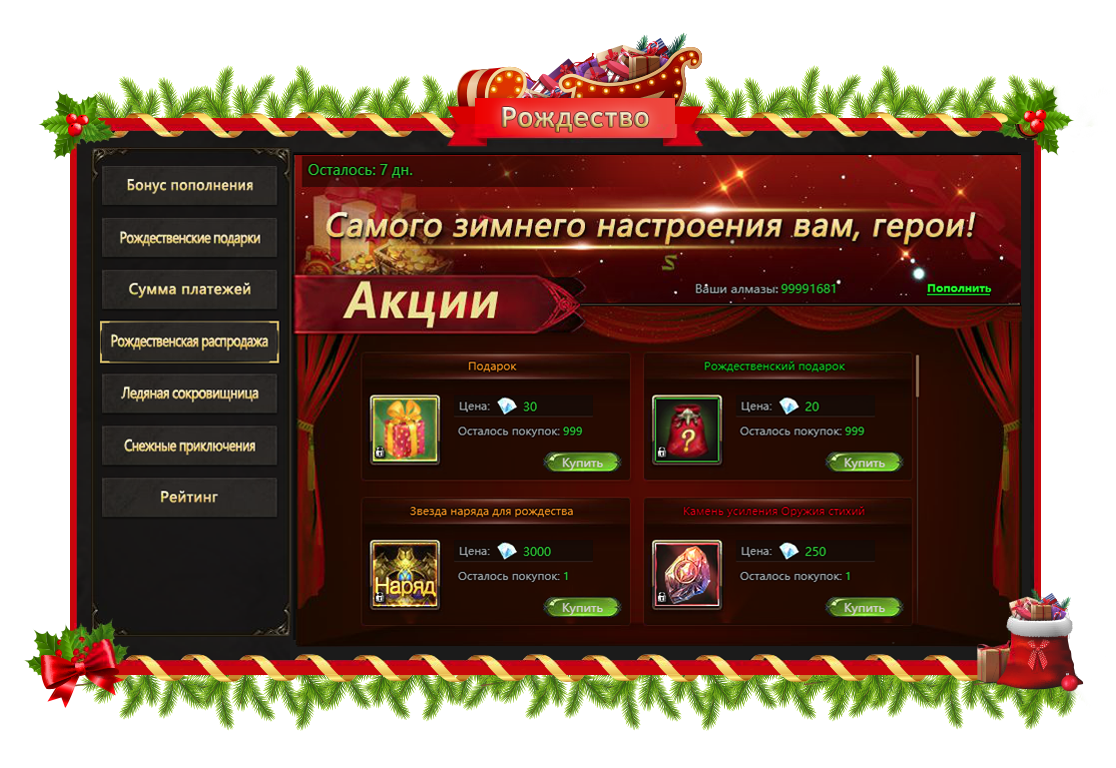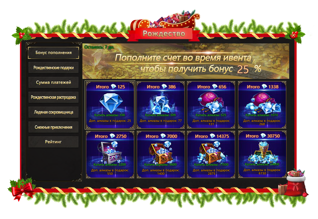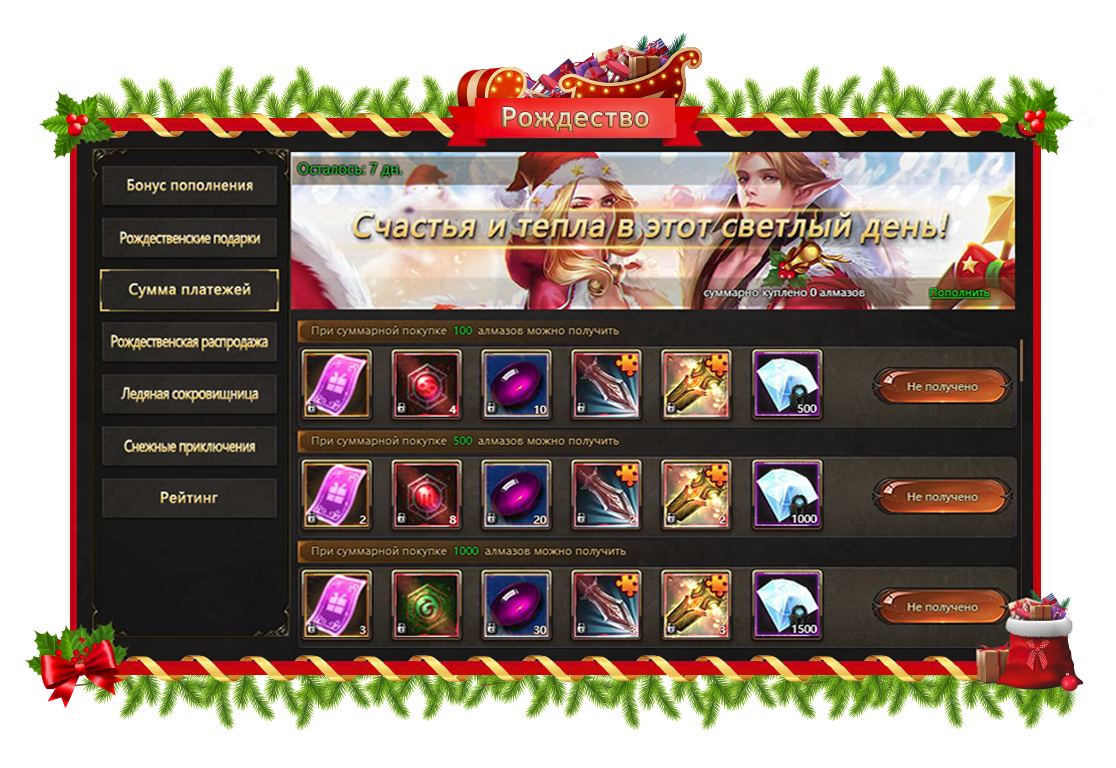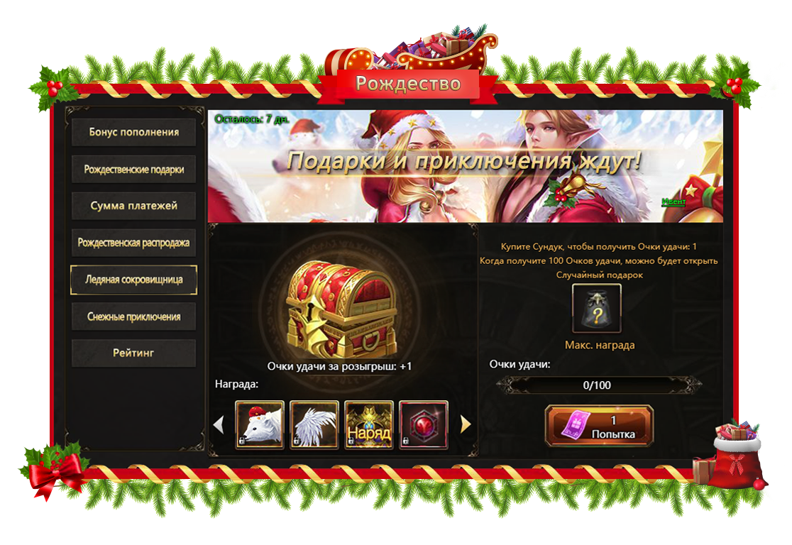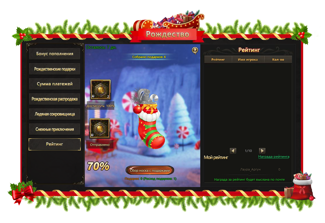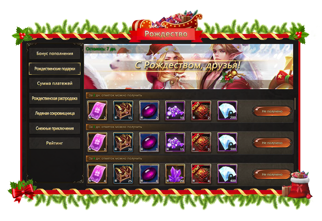Заходите в игру в течение 7 дней и получайте награды. Соберите все подарки праздничного фестиваля!