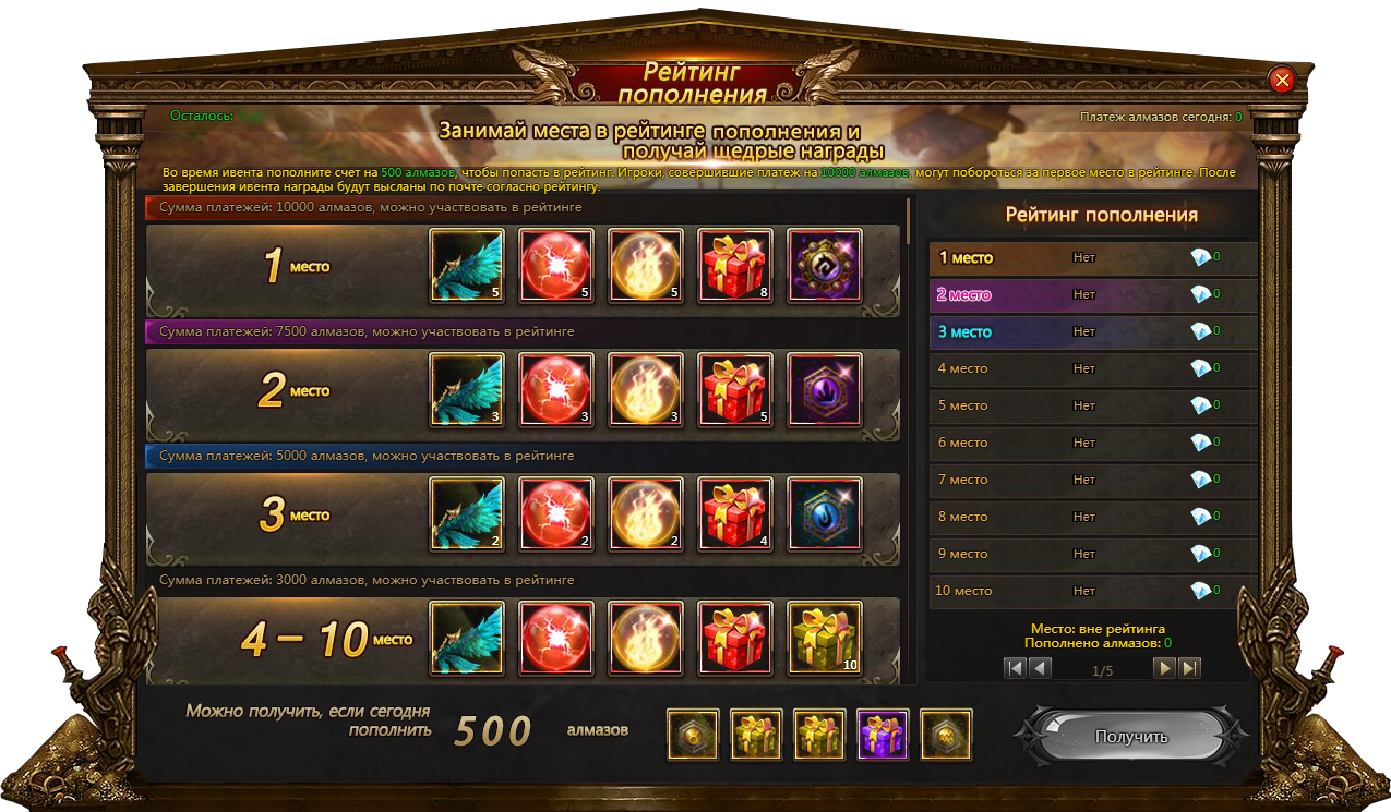 При трате алмазов в рамках данного ивента у вас есть шанс занять почетное место в специальном рейтинге и стать обладателем множества наград. Кроме того, при трате на сумму не менее 500 алмазов за один день вы можете получить набор ценных призов.