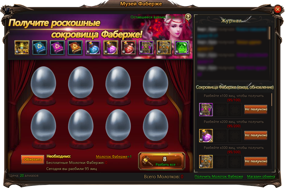 Ежедневно игрокам доступно 3 бесплатных попытки разбития яиц, для последующих необходимы специальные Молотки. Получить их можно при покупке Ключей удачи, стоимость 1 ключа составляет 20 алмазов.