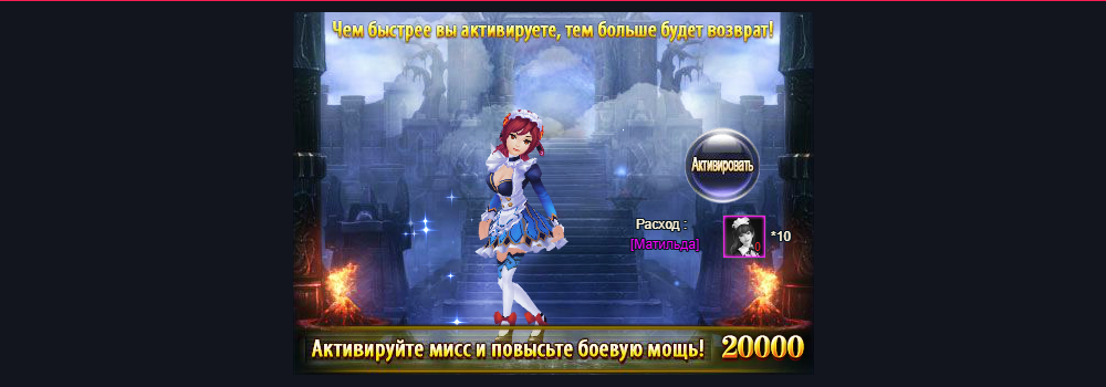 Команда поддержки «Мисс и компания» обзавелась новой помощницей! Теперь у вас есть возможность пополнить свой отряд Мисс Матильдой - очаровательной горничной, готовой исполнить любое пожелание своего хозяина. После её активации на стартовом уровне вы получите дополнительно 20к боевой мощи.