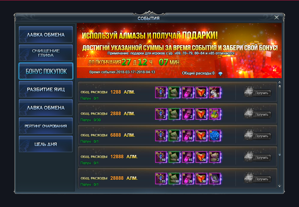 3. С 17 марта до 13 апреля доступна акция «Бонус покупок» - используйте алмазы и получайте ценные подарки!