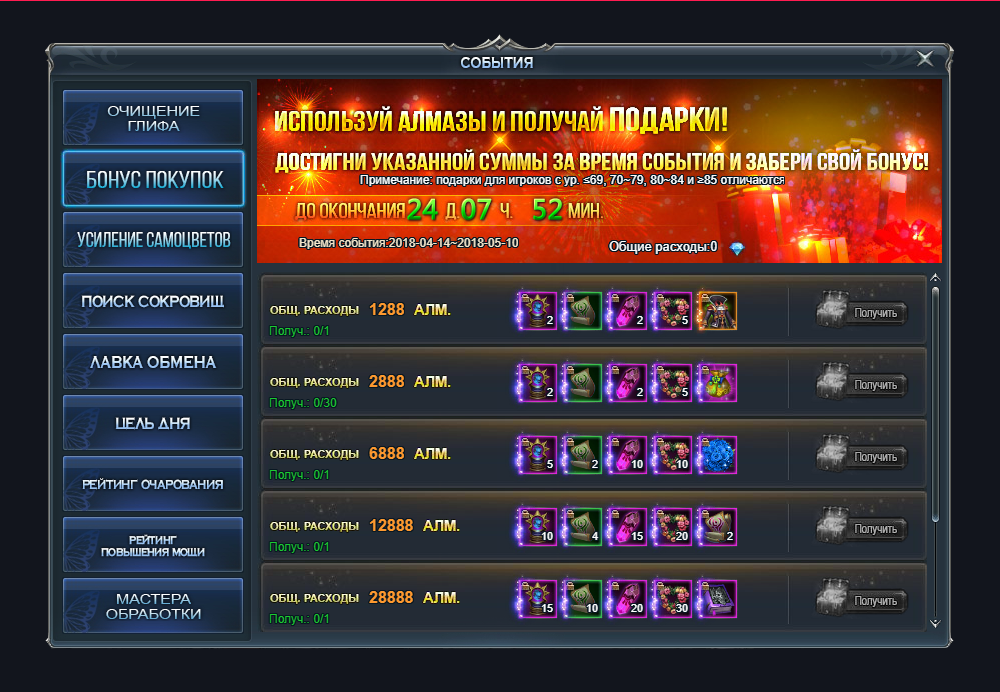 • не упустите шанс поучаствовать в акции «Бонус покупок» - используйте алмазы и получайте много ценных подарков!